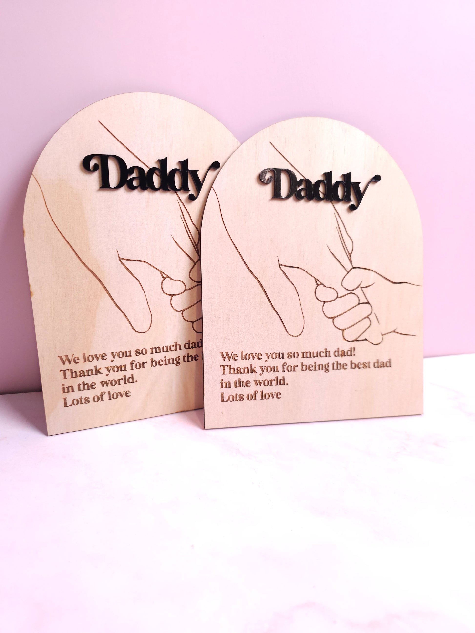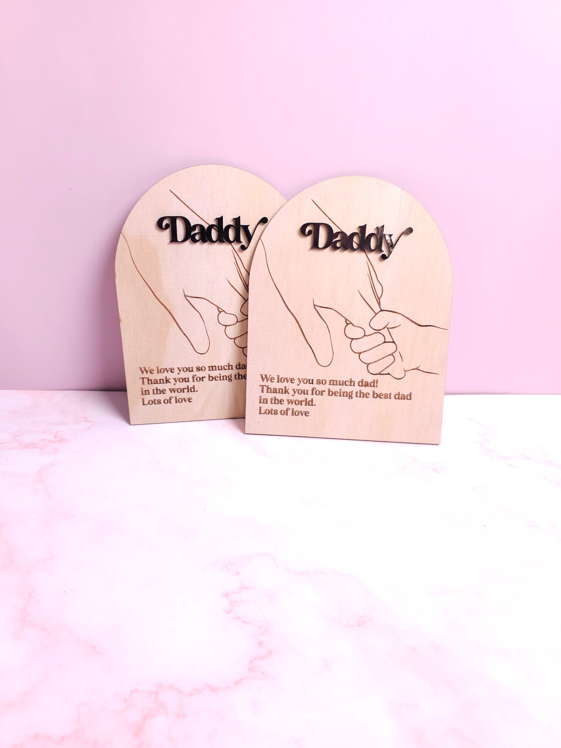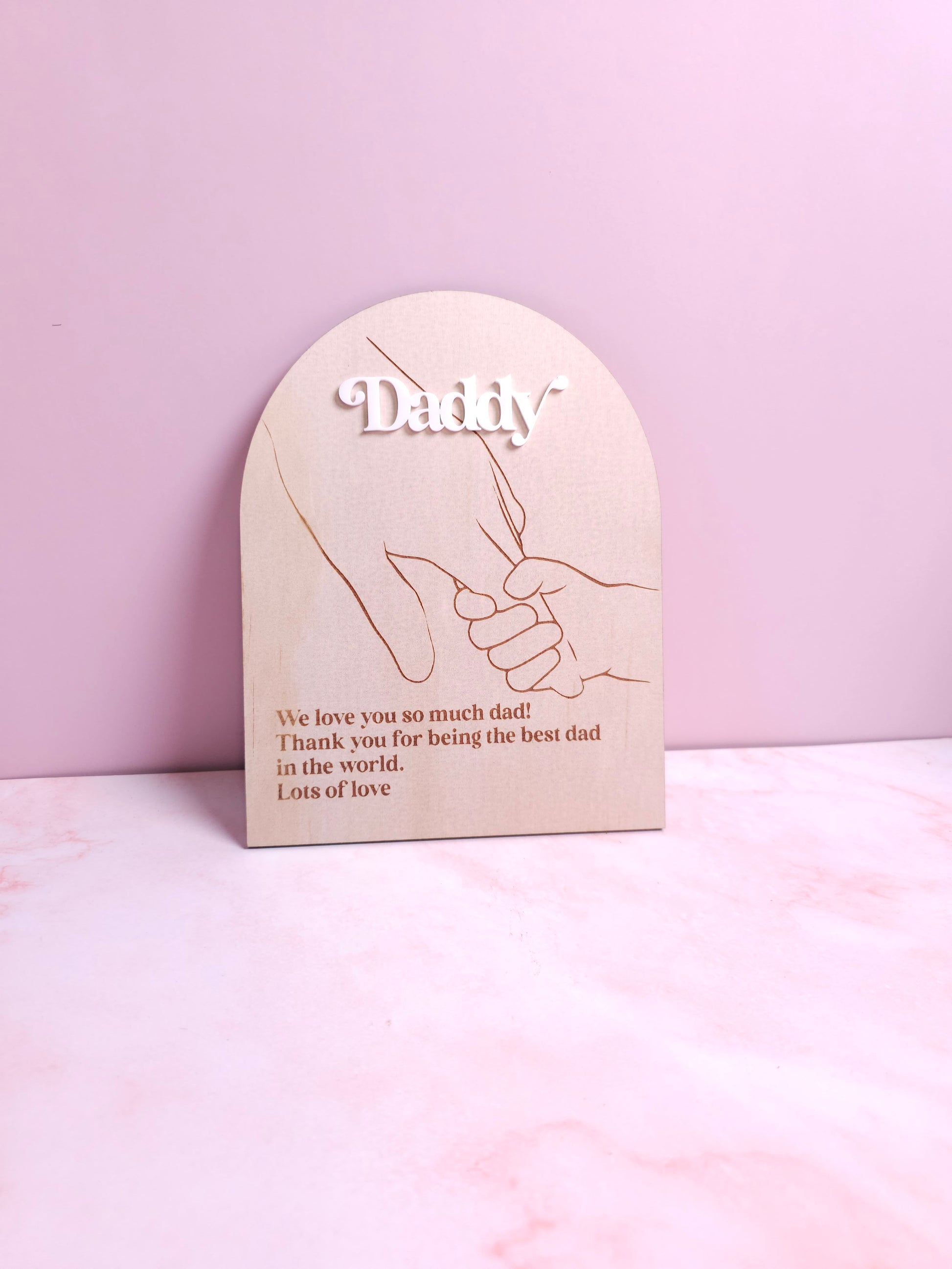 Give dad the recognition he deserves this Father's Day with our special "Holding Hands" plaque. This timeless wooden piece features an exquisite acrylic accent and can be personalized with a name or message. Show your dad your appreciation with this one-of-a-kind gift.