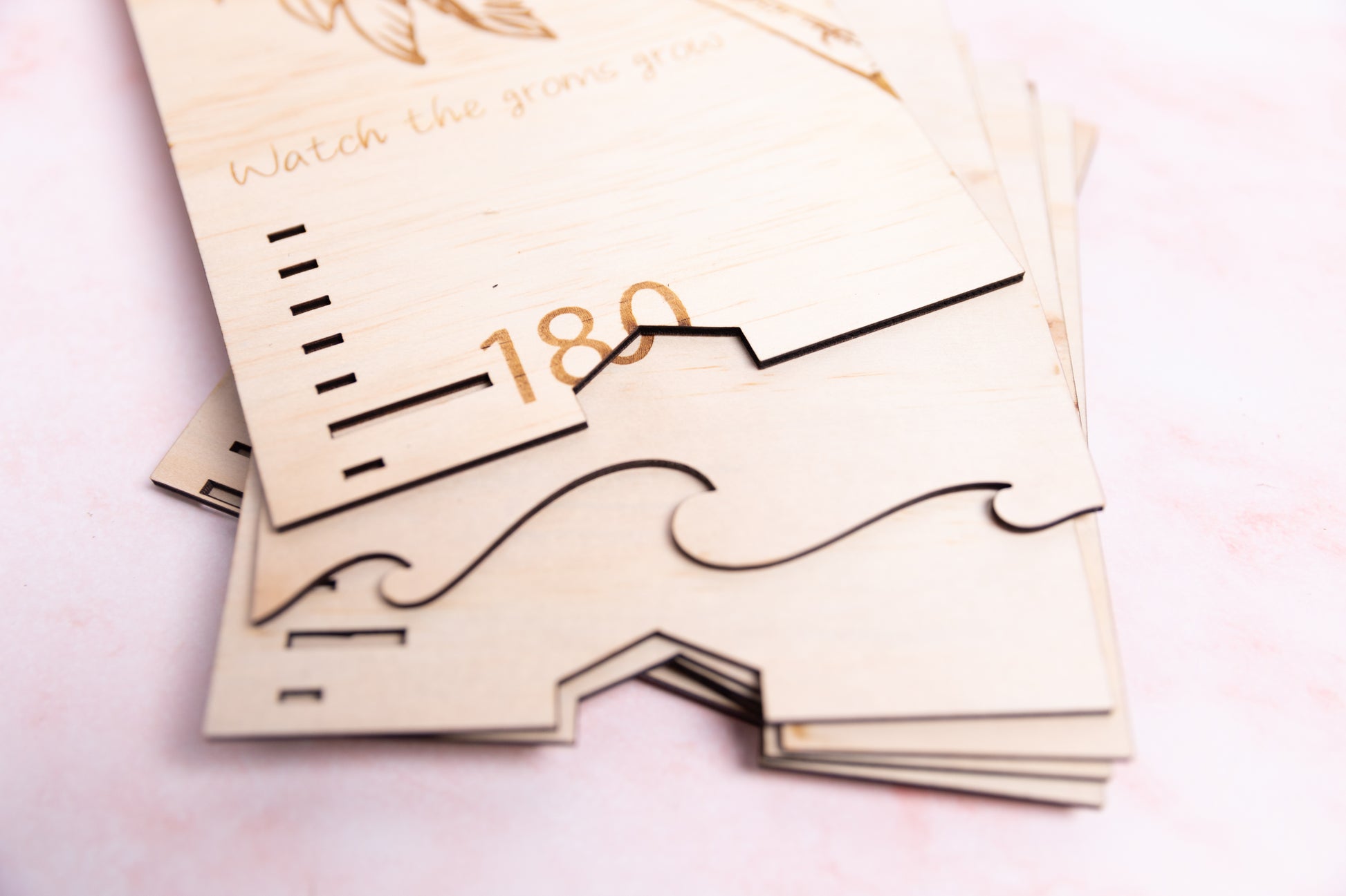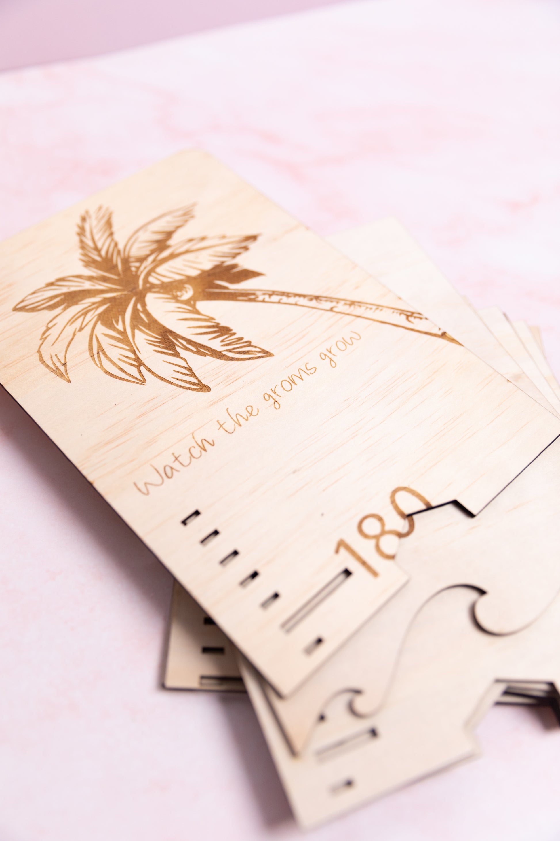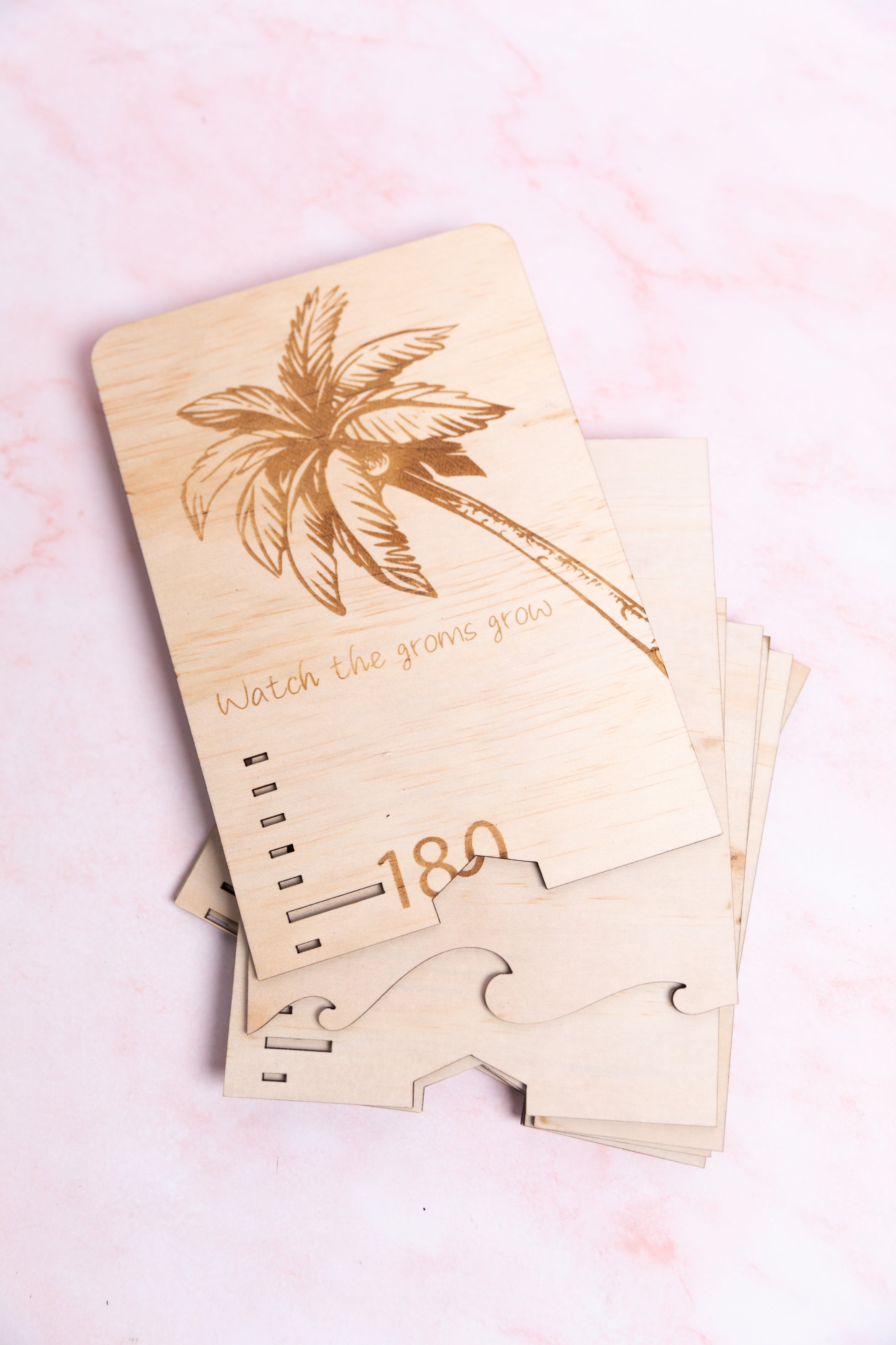 This unique height chart is designed to watch your child grow. It features a wave-cut base with an intricately engraved palm tree at the top, providing an elegant look. Keep track of your child's yearly progress and marvel at how they grow!